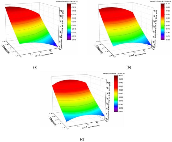 Simulated radiation efficiency computed at a changing εr′ and εr″ of the antenna substrate up to ±20% concerning the measured values in Table 1: (a) at 2.40 GHz; (b) at 2.44 GHz; (c) at 2.48 GHz.