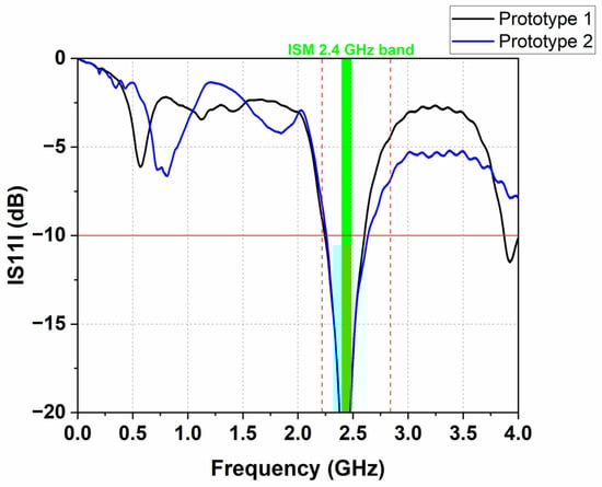The measured |S11| of Prototype 1 and Prototype 2 are shown in Figure 10. As we can observe, the |S11| curves of Prototype 1 and Prototype 2 are almost identical, indicating that both conductive textile and copper foil are suitable for fabricating antenna-radiating elements. Moreover, the bandwidth of both prototypes fully covers the ISM 2.45 GHz. Comparing the |S11| curves of Figure 5 and Figure 10, we can see that the measured results align reasonably well with the simulated ones. The disparity between the measured and simulated results is predominantly due to fabrication tolerances and the impact of the W.FL connector. Additionally, changes in the electromagnetic properties of the substrate, which is from a leaf of a ZZ plant, may also contribute to the slight variance observed between the measured and simulated results. In confirmation of the assumption made regarding the influence of the electromagnetic properties of the substrate on the antenna parameters, we can see that both antenna prototypes exhibit better impedance matching than the simulations. However, their bandwidth is narrower compared to the antenna bandwidth in xFDTD. This slight difference in |S11| and bandwidth may be because, during the |S11| measurements, the real part of the relative permittivity of the antenna substrate (ZZ Plant leaf) was higher than the value used in the simulations listed in Table 1. From the parametric study (Figure 9), we can observe that increasing εr′ results in a decrease in bandwidth.