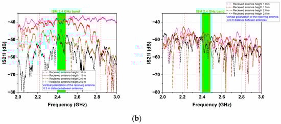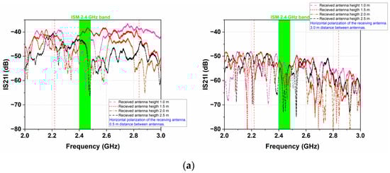 The measured transmission coefficient magnitudes are presented in Figure 11 for two orientations of the dipole antenna (Figure 11a horizontal and Figure 11b vertical) at two distances (0.5 m and 3 m) between antennas.