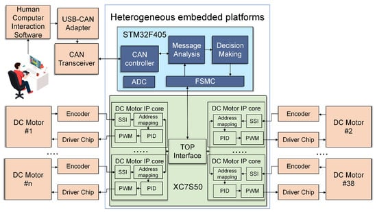 In this research, we developed a physical platform with MCU + FPGA as the core. It has the scalability and flexibility to increase the number of axes of the motor being controlled as required. The MCU + FPGA heterogeneous embedded platform solution proposed by us has cost-effective performance in the face of motor control of tens of axes. The XC7S50 FPGA we used can control up to 45-axis micro DC motors synchronously by reusing the designed motor IP core in this paper, and a XC7S75 FPGA with 400 pins can control up to 75-axis motors synchronously. Moreover, the designed IP core has low consumption of logical resources, which provides the possibility for further optimization of the motor control algorithm.