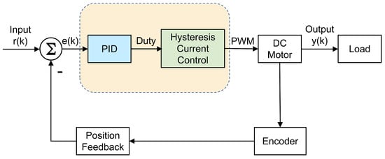 Senthilnathan, A. et al. designed a brushless DC motor controller based on FPGA by adopting hysteresis current control in order to obtain stable torque fluctuation and fast response [32]. In order to ensure the high real-time performance of the multi-motor servo system and the stability of the motor operation, this paper adopts the dual-loop control structure of the position loop and current loop; the modulation frequency of the two is 10 kHz and 195.31 kHz, respectively. The position loop is used as the main loop with the proportional–integral–derivative (PID) control algorithm. The motor’s actual position is tracked in real time, and the difference between the position reference value and the position feedback value is made. The error is sent to the position loop controller and calculated by the control algorithm to obtain the duty cycle. The duty cycle is sent to the drive chip to generate two PWM waves and then transmitted to the drive circuit to drive the motor operation. The current loop adopts hysteresis current control, built into the driver chip to inhibit current interference. The maximum current through the armature is limited to prevent motor damage. The dual-loop control structure is shown in Figure 2.