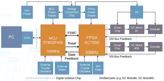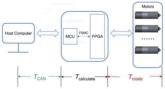 Therefore, in order to realize high precision and high real-time control of a multi-motor servo system, a multi-servo motor control scheme based on the MCU and FPGA heterogeneous embedded platforms is proposed in this paper. This scheme combines the computing power of MCU with the parallel processing capability of FPGA. The design of the control system is divided into two parts by software and hardware function division. The first part is the MCU as the central processor. MCU has rich peripherals and powerful processing performance and can interact with the host computer to complete data analysis, calculation, and delivery. At the same time, the MCU acts as the monitoring center of the whole system and monitors the status of each unit. The second part is the FPGA as a co-processing unit. A motor controller IP core is designed, packaged, and multiplexed to accomplish the real-time control of multi-axis servo motors by taking advantage of the parallelism of FPGA. In addition, the real-time performance of heterogeneous embedded platforms is ensured by using the FSMC parallel bus to realize cross-clock data interaction between MCU and FPGA. The diagram of a multi-motor servo control system with the heterogeneous embedded platforms as the core is shown in Figure 1.