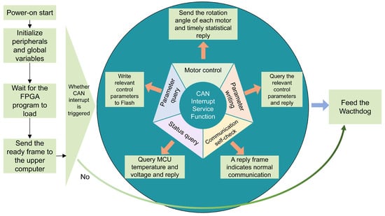 The communication self-test function can detect whether the CAN communication is normal. The control parameters are stored in the Flash of MCU, and the parameter writing and parameter query functions are the assignment and query reply to these control parameters, respectively. The motor control function is the most important function of the system. When performing this function, the MCU analyzes the data field of the CAN frame, calculates each motor’s rotation angle, and finally sends the information to the FPGA, which controls each motor’s rotation. After waiting for a certain period, the MCU counts the rotation status of each motor and replies to the host computer. The processor status query function queries the MCU temperature and voltage and then replies to the host computer. The temperature and voltage data can be used to measure whether the system is working normally.