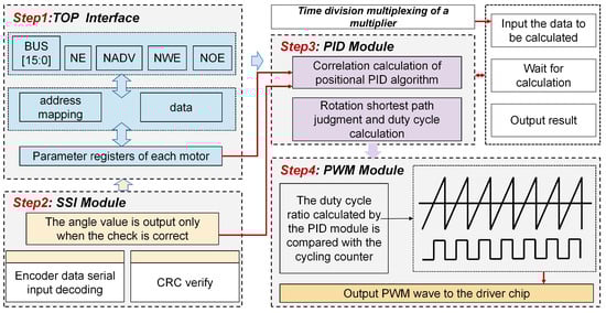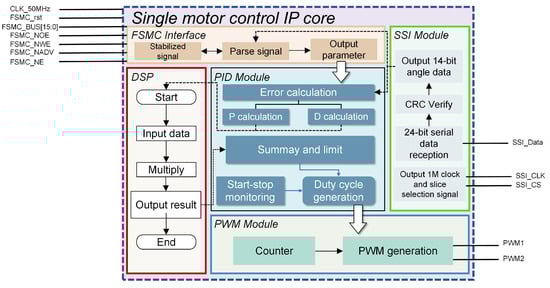 A single micro DC motor control IP core is designed according to the top–down design idea. It includes the FSMC interface module, PID algorithm module, synchronous serial interface (SSI) module, PWM module, and so on. By enabling the gated clock in the FSMC interface module, other modules can be effectively controlled, which is more conducive to the internal timing constraints of FPGA. Finally, the IP cores are instantiated and reused at the top layer to construct a micro-DC motor multi-axis servo control co-processing unit based on FPGA. The FPGA design framework of single motor control IP core is shown in Figure 6, and the working flow chart of multi-motor control is shown in Figure 7. The TOP-Interface accesses individual cores through different register address spaces.