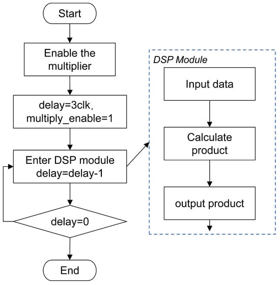 The specific operation flow of the multiplier time-division multiplexing is shown in Figure 9. A multiplication enable is generated before each multiplication calculation, and the corresponding multiplier and multiplicand are simultaneously inputted to the FPGA hardware multiplier. The multiplier calculation requires a certain clock cycle, and the delay is set to ensure the completion of the multiplication calculation. After the calculation, the multiplier returns the result, and the enable is turned off to wait for the next multiplication operation.