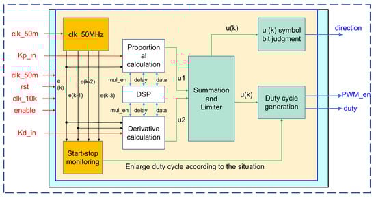 This design uses the positional digital PID algorithm. According to Equation (4), the positional digital PID algorithm is prone to integral saturation when the error between the current and target positions is relatively large. The nonlinear PD control can realize faster and more accurate positioning of the servo control mechanism [33]. In this design, PD control is used to avoid integral saturation, and the output saturation limit is carried out to prevent the duty ratio passed to the PWM module from being too large.