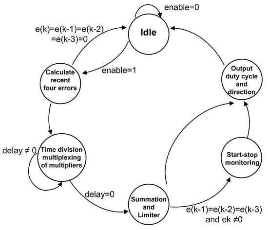 The block diagram of the structure of the positional digital PID module is shown in Figure 10. The input set angle and target angle are both 14-bit unsigned numbers, and the error generated by their computation is a signed number with a bit width of 15 bits, which is negative when the highest bit is 1 and positive when the highest bit is 0. Since the data transmission width of FSMC is 16 bits, the bit widths of the P and D parameters are set to 16-bit unsigned numbers. The entire module is controlled by the enable transmitted by the FSMC interface module, and the calculation is performed when the enable is detected. When the enable is not detected, the registers will all be cleared to avoid power consumption from bit flipping. The entire position loop algorithm is implemented by a finite state machine with a frequency of 10 kHz. The state-hopping schematic of the finite state machine is shown in Figure 11.