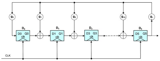 where g corresponds to the highest degree of the polynomial, is the coefficient, takes the value 1, and other coefficients can be 0 or 1. The polynomial can be represented by a linear feedback shift register (LFSR). The schematic diagram of Galois LFSR is shown in Figure 12.