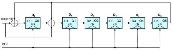 The LFSR consists of D flip-flops (which can also be seen as registers), XOR gates, and feedback branches. The individual coefficients from to determine whether this feedback branch exists, with a 1 indicating it exists and a 0 indicating that it does not. The register needs to be assigned an initial value where all the initial values are 0. Figure 13 is a depiction of serial data, with each bit of data requiring one clock cycle. According to the idea of parallel computing, the original data are input in parallel into the branch with coefficient 1 to increase the rate. The data are input from the input side by bit from high to low. According to the data provided by the chip manual, the CRC-generated polynomial adopted by MT6701 is , and the corresponding polynomial is 1000011. The digital circuit model of its modulo 2 operation is shown in Figure 13.