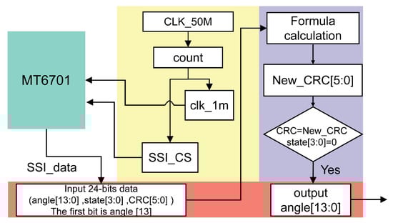 The formula method can perform the calculation quickly, avoiding the consumption of hardware storage resources by the look-up table (LUT) method. The CRC codes calculated by Equation (7) are compared with the received CRC codes. If the CRC codes are equal, the transmission is considered normal. In the case of an incorrect transmission, the angle register on the FPGA side will not be updated. However, it will retain the correct value from the previous cycle until the CRC checksum is correct for the next angle transmission cycle. The frequency of the motor angle update needs to be faster than the control cycle of the position loop in order to reduce the power consumption caused by clock reversal. The input clock of the encoder is set to 1 MHz, and the angle update frequency is finally 20 kHz. The design diagram of the SSI module is shown in Figure 14.