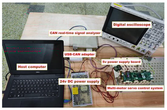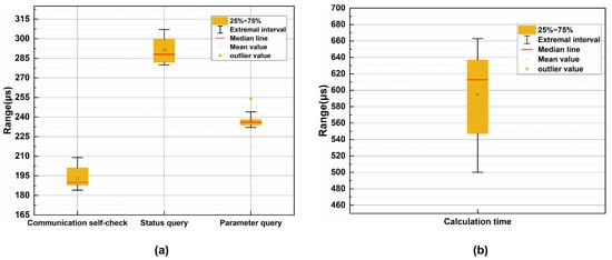 For the communication self-test function, the status reply function, and the parameter query function, 20 repetitions of the experiments were conducted using a CAN real-time signal analyzer to test the specific performance of the system’s CAN communication, respectively. The results show that there is a slight jitter in the response time of the commands for different functions. The average response time for the communication self-test is 193.2 µs, for the status reply, it is 291.3 µs, and for the parameter query, it is 237.2 µs.