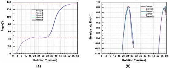 The response performance of the motor to position mutation is also tested as shown in Figure 19. Five sets of experimental tests are carried out on the same motor. First, the motor is controlled to 45°, and then the motor is ordered to 135° at 30 ms. In the process of position mutation, the micro DC motor still has a fast response and high rotation accuracy, and the steady-state error does not exceed 1°.