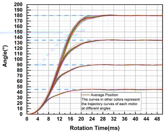 For the target positions for the experiments of 38-axis motor rotation, 45°, 90°, 135°, and 180 ° were selected. The average value of the running trajectory of the 38-axis motors was used as the reference position curve, and the process error of each axis motor and the steady state error after reaching the target position were analyzed. And they are presented in Table 6.