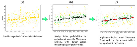 Overview of maximum entropy with consensus constraints (MECC). In (a), a two-dimensional representation of balanced data with a outlier ratio is provided. In (b), each point is categorized as either an inlier or an outlier. (c) Green represents the detected inliers, while red represents the outliers. Each data point is assigned an inlier probability, with darker colors indicating higher probabilities. This demonstrates that by focusing on data points with higher inlier probabilities, our methodology can robustly estimate potential geometric relationships in datasets with a high outlier ratio, as depicted by the red line.