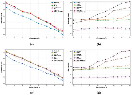 In the experimental findings, MECC-RANSAC demonstrates competitive consensus performance, particularly within outlier proportions ranging between and . It achieves a comparable performance across various outlier ratios. Conversely, MECC-L1 attains similar performance levels when compared to VSAC, showcasing superiority over other existing methods. Regarding computational efficiency, RANSAC-based methods exhibit an exponential decrease in efficiency as the proportion of outliers increases. In contrast, approaches relying on maximum consensus demonstrate more consistent and efficient performance. However, MECC-RANSAC displays a time-consuming performance pattern similar to that of RANSAC-based methods due to its initialization process. Furthermore, although MECC-L1 does not notably enhance efficiency compared to EES, it demonstrates preferable robustness with negligible performance loss at the millisecond level. This outcome can be attributed to the insufficient credibility of the inliers when the number of outliers exceeds that of the inliers. Our method endeavors to bolster the credibility of inliers by assigning a probability of being an inlier to each data point, thereby exhibiting more pronounced superiority over existing methods, particularly in scenarios with higher outlier proportions. Additionally, utilizing RANSAC for initialization can yield more precise local optima compared to the SVD approach, albeit with some compromise on efficiency.