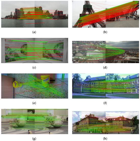 Visual results obtained from our proposed method are demonstrated for (a–d) homography estimation from homogr and (e–h) fundamental matrix estimation from kusvod2. In the visuals, the green and red lines correspond to detected inlier and outlier correspondences, respectively.