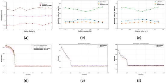(a) A comparative assessment of the efficiency of the ADMM-based solution using synthetic data. (b,c) Graphical representations depicting the variation in the number of inliers, processing time, and geometric error as a function of the scheduling parameters and , employing HPatches. (d) Illustration showcasing the typical convergence behavior of the improved ADMM algorithm, initialized using RANSAC and norm, observing the iteration gap of using HPatches for homography and PhotoTour for fundamental matrix estimation. Typical convergence behavior of the improved ADMM with RANSAC and norm-based initialization, focusing on the residual metric and using (e) HPatches for homography and (f) PhotoTour for fundamental matrix estimation.