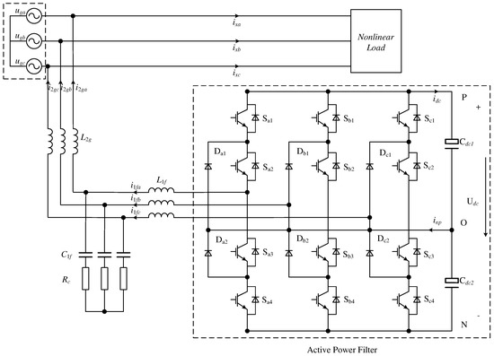 The rapid advancement of power electronic technology has led to an increasing application of nonlinear power electronic equipment in the power system, which results in severe harmonic pollution of the power grid and serious distortion of grid voltage and current. This will not only impact power quality, but also lead to additional losses in the distribution network. And excessive harmonic current may interfere with the operation of sensitive loads. Therefore, how to address the harmonic pollution and enhance the power quality has become a pressing concern [1,2,3]. Although various methods have been proposed for harmonic suppression, traditional passive filters are limited by their size, resonance issues and fixed compensation capability [4]. An active power filter can dynamically compensate for various harmonics and have become the most widely used harmonic suppression devices. The proposition of the three-level topology reduces the voltage stress of the switching devices, and it enables APF to be applied in occasions of high voltage, large current, and large capacity [5,6].