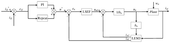 The block diagram of the repeat PI–LADRC decoupling control is depicted in Figure 8. The repeat PI controller offers feedback control to stabilize the system and rectify periodic errors in the stable closed loop; thereby, it can enhance the tracking accuracy of the system. The LADRC controller is employed to attenuate disturbances, including inverter-side current feedback errors, model simplification errors, d-q axis coupling effects and external unknown disturbances. Thus, it can improve the robustness and performance of the system and enhance the harmonic compensation effect of APF.