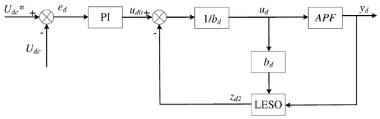 A well-designed voltage outer loop can effectively mitigate voltage fluctuation and enhance the harmonic compensation effect of APF. The conventional DC-side voltage regulation method typically employs PI control, which is straightforward to implement and capable of effectively managing DC-side voltage. However, its dynamic adjustment ability is limited when APF is connected to the grid. To further enhance the control performance of the voltage outer loop, a composite control incorporating LADRC is introduced. Considering that the microcomponent of LSEF is generated by LESO observation and entails certain delay, a PI and LESO control structure is adopted to replace LSEF with PI. The block diagram for the PI and LESO control is depicted in Figure 9.