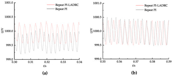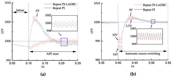 Firstly, a steady-state analysis is conducted. As shown in Figure 10, in the steady-state phase, both control strategies effectively track the harmonic current, and there are no significant differences in tracking performance. Furthermore, it can be known from Figure 11a that when the compensation current of the APF system is stable at 84 A, the DC-side potential using the repeat PI–LADRC decoupling control strategy fluctuates within the range of ±0.5 V, while the traditional repeat PI control fluctuates within the range of −1 V to +0.5 V. And, from Figure 11b, it can be known that when the compensation current is stable at 129 A, the steady-state fluctuations of the DC voltage of the two control strategies are almost the same, both within the range of ±0.5 V. Consequently, there is minimal percentage variation observed. The above analysis indicates that during steady-state control processes, the performance difference between traditional repeat PI control and repeat PI–LADRC decoupling control in harmonic current tracking and DC voltage regulation is very small; however, repeat PI–LADRC decoupling control holds certain advantages.