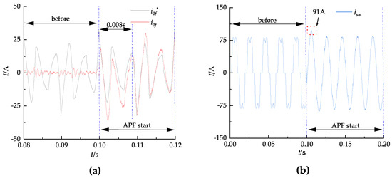 Secondly, it is analyzed from the perspective of dynamic control. It can be observed from Figure 12a and Figure 13a that, after starting APF, repeat PI control requires 0.008 s to track the command signal, whereas repeat PI–LADRC decoupling control achieves instantaneous tracking during implementation. As depicted in Figure 12b and Figure 13b, adoption of repeat PI control results in excessive power grid current, and the compensation current overshoot reaches 91 A. Leveraging the anti-interference capability of LADRC, repeat PI–LADRC decoupling control effectively mitigates overshoot and reduces compensated current overshoot to 84.4 A, achieving non-overshoot tracking. In Figure 16a, the difference of voltage modulation on the DC-side under different control strategies can be more clearly observed. Under repeat PI control, there is evident overshoot, while repeat PI–LADRC decoupling control can effectively mitigate overshoot and ensure smooth tracking.