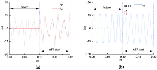 Simulation of APF startup using repeat PI–LADRC decoupling control. (a) Filter tracking current. (b) Phase a grid current.
