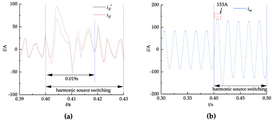 In the same simulation environment, and with identical simulation parameters, a double closed-loop control system with a feedforward decoupling control for decoupling, a repeat PI control for the current inner loop, and a PI control for the outer voltage loop is chosen as the reference for comparison. To simultaneously evaluate the steady-state and dynamic control performance of these two strategies, APF is initiated at 0.1 s for harmonic suppression, and switches the harmonic load at 0.4 s (resulting in a sudden increase in load current). Taking phase a as an example, the simulation graphs are depicted in Figure 10, Figure 11, Figure 12, Figure 13, Figure 14, Figure 15 and Figure 16.