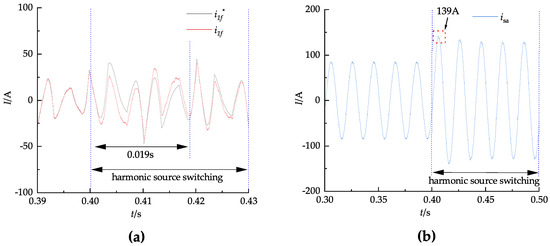 Simulation of harmonic load switching for repeat PI–LADRC decoupling control. (a) Filter tracking current. (b) Phase a grid current.