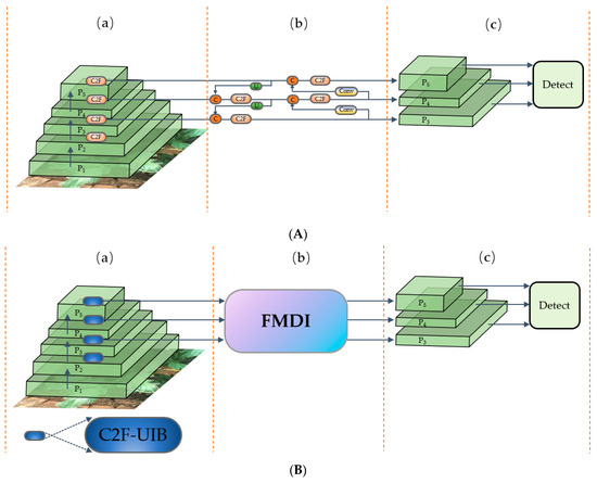 (A) The network architecture of the original YOLOv8 [6]. (B) The overall architecture of YOLO-FMDI. Among them, (a) the model backbone, (b) the model neck part, and (c) the model detection output part.