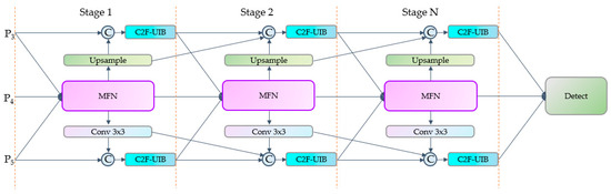 Subsequently, the features focused by the MFN are processed through three branches: (1) by upsampling and fusing with the P3 scale features, then passing through a lightweight C2F–UIB module, mixing semantic information from different spatial and channel dimensions; (2) by a 3 × 3 convolutional downsampling operation and fusing with the P5 scale features, also passing through another lightweight C2F–UIB module; (3) directly outputting from the MFN. Finally, the multi-scale features outputted from the above three branches serve as the input for the MFN module with three different scales of features in the next stage. Simultaneously, starting from the second stage, the upsampling and downsampling features from the previous stage are also inputted to the next stage, as shown at the Concat position in Figure 2. This process is repeated until the Nth stage is completed. Through this focusing and diffusion mechanism, features with rich contextual semantic information are diffused to various detection scales, further enhancing the expressiveness and generalization ability of the model.