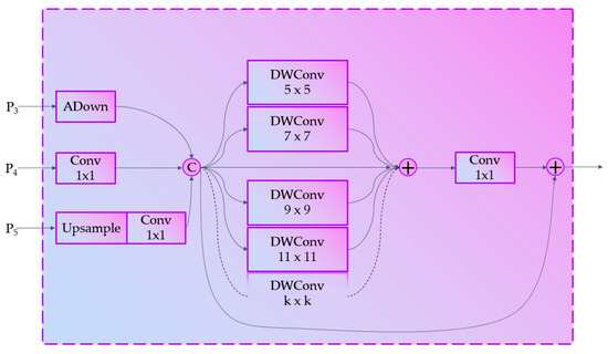 The Multi-core Focused Network (MFN) consists of multi-scale pyramid layers and multi-core deep convolutional layers. In the multi-scale pyramid layers, upsampling, Conv 1 × 1, and the novel lightweight ADown [22] downsampling are introduced. The ADown [22] module reduces model complexity by optimizing the number of parameters in the convolutional layers while preserving as much image information as possible without affecting object-detection accuracy. Meanwhile, the multi-core deep convolutional layers extend the receptive field through different convolutional kernel sizes to capture multi-scale texture features, thereby enhancing the network’s long-range modeling capability, as shown in Figure 3. Specifically, after focusing and fusing the features, a set of parallel depth-wise convolutional layers with different receptive fields and residual structures are introduced to capture cross-scale contextual semantic information (e.g., k = 5 × 5, 7 × 7, 9 × 9, 11 × 11). Subsequently, a Conv 1 × 1 and residual structure are used to further capture more local information. This process can be represented as: