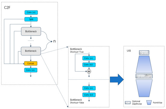 The C2F module in YOLOv8 has evolved from the C3 module in YOLOv5. As shown in Figure 4, within the bottleneck block, the input first passes through a 1 × 1 convolutional layer, followed by a 3 × 3 convolutional layer, and is finally added to the initial value through a residual structure. As can be seen, the C2F block contains more skipped connections, eliminates the convolution operation in branches, and introduces an additional splitting operation. This structural design allows for the capture of richer feature information. To further lightweight this module while maintaining detection accuracy, we incorporate the new and efficient Universal Inverted Bottleneck (UIB) block to replace the original bottleneck block. This module can flexibly adapt to building models with various optimization objectives without the need for complex searches. While maintaining a similarly simple structure, it shares common modules such as pointwise expansion and projection, enabling the C2F module to temporarily make trade-offs between spatial and channel mixing. The optimization of the above modules further maximizes computational utilization and serves to lightweight the model.