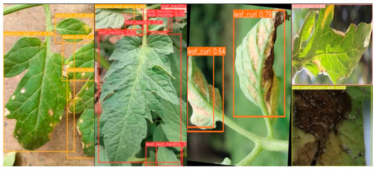 The experimental dataset comprised 1810 images of healthy and spotted tomato leaves collected by us, along with 2700 images of leaf curl, wilt, and blight diseases [24]. In our experiments, we divided the 4510 images in the tomato pest and disease dataset according to the ratio of 8:1:1, specifically categorized as a training set of 3608 images, a validation set of 451 images, and a test set of 451 images. Tomato leaf blight, leaf curl, septoria leaf spot, and verticillium wilt are important phytopathological concerns in tomato cultivation. The fungus Alternaria solani induces leaf blight, which is characterized by concentric, necrotic brown lesions that result in early leaf shedding and diminished photosynthetic efficiency. Various begomoviruses are responsible for leaf curl, which causes leaves to yellow and curl upwards, inhibiting plant development and reducing fruit production [25]. Septoria lycopersici is the pathogen behind septoria leaf spot, manifesting as small, round lesions featuring dark borders and pale centers, which merge over time, inflicting widespread foliar harm [25]. Verticillium wilt, caused by either Verticillium dahliae or V. albo-atrum, is identifiable by the wilting, yellowing, and death of lower foliage, often affecting one side of the plant due to vascular system invasion [26]. These pathogens severely disrupt crucial physiological functions in tomato plants, including carbon fixation, nutrient circulation, and water absorption [27]. The consequences include decreased plant vitality, restricted growth, and accelerated aging. Collectively, these diseases lead to significant reductions in crop yield, deterioration of fruit quality, and lowered market value, presenting substantial financial obstacles for tomato growers globally. Due to the limitations imposed by the local cultivation conditions at the time, we could not obtain physical samples of leaf curl, wilt, and blight diseases. Consequently, we supplemented our dataset with the images of these three disease categories from [24]. Partial dataset images are displayed in Figure 5. We conducted extensive ablation and comparative experiments on this curated dataset to validate the efficacy of our proposed optimized model in detecting pests and diseases affecting vegetation.