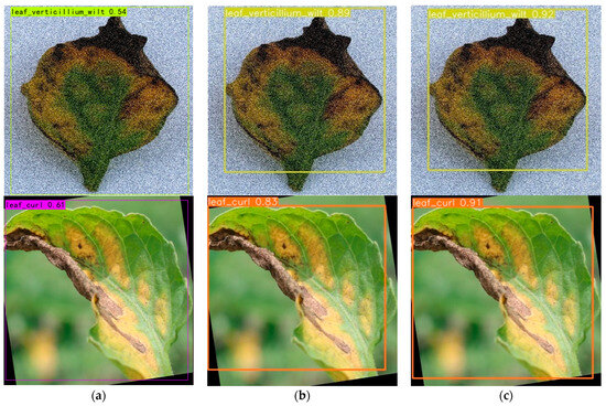 As shown in Figure 6 the visualization of the detection results of the three different models is displayed. We selected the models with the clearest difference in detection results, YOLOv5s and YOLO-FMDI, and also selected the baseline model YOLOv8n. From the detection results of diseased tomato leaves, the mean average precision (mAP50) of YOLOv5s, YOLOv8n, and YOLO-FMDI in detecting leaf verticillium wilt were 0.54, 0.89 and 0.92, respectively. The mAP50 of our proposed model is 0.03 higher than the mAP50 of the baseline model and 0.38 higher than the mAP50 of the YOLOv5s model. Meanwhile, it can be seen that the mAP50 of the YOLO-FMDI model in detecting leaf curl is 0.91, which is 0.08 higher than the 0.83 of the YOLOv8n model and 0.30 higher than the 0.61 of the YOLOv5s model. Therefore, the detection ability of our proposed model YOLO-FMDI is better than the other models.
