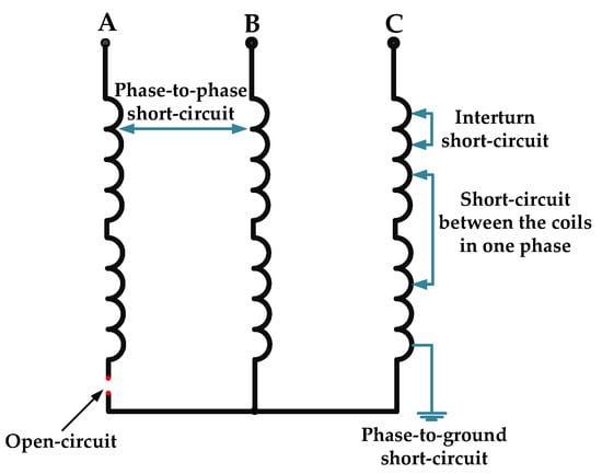 Stator winding faults also include open-circuit (open-phase) faults [16]. A three-phase PMSM with an open-circuit fault in one of the phases is still capable of operating within a certain load range. However, this type of fault introduces a significant asymmetry in currents and voltages and thus causes the motor to malfunction. Compared to ITSCs, an open-circuit fault occurs less frequently and is most often caused by the cracking of the solders connecting the windings under vibration or the improper connection of the motor. Typical types of stator winding faults are presented in Figure 1. Short-circuits in the stator winding are not only one of the most common AC motor faults, but also the most destructive. Typically, this type of fault starts with ITSC (short-circuit between adjacent turns in one of the coils), which causes current to flow in the shorted circuit with an amplitude usually reaching multiples of the rated current. The short-circuit current causes a significant local increase in the temperature of the winding, leading to further degradation of the insulation.