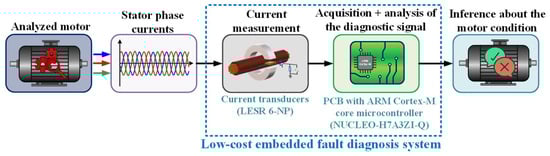 A detailed description of the process of configuring measurement, acquisition, and processing of a diagnostic signal using a low-cost microcontroller can be helpful in the development of embedded diagnostic systems designed for various fields. Implementation of a method for condition monitoring of PMSM stator winding faults on a low-cost microcontroller is rare in the literature. Therefore, this work can make an important contribution to this field. Moreover, the module can be installed non-invasively between the inverter and the monitored motor, which also increases its potential for industrial implementation.