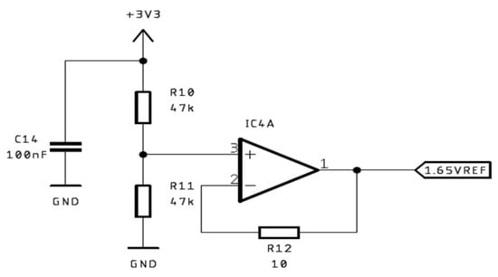 To set the UEref, a low-impedance signal is required. The easiest way to generate it is to use a symmetric resistor divider to divide the 3.3 V rail, which is also the reference voltage for the ADC, in half—thereby creating a 1.65 V reference. This signal is then buffered using an operational amplifier. A schematic of this solution is presented in Figure 3. As the 1.65 VREF signal is a static one, the main requirement of the operational amplifier is low input offset voltage. For this reason, the MCP6V02E amplifier was chosen.