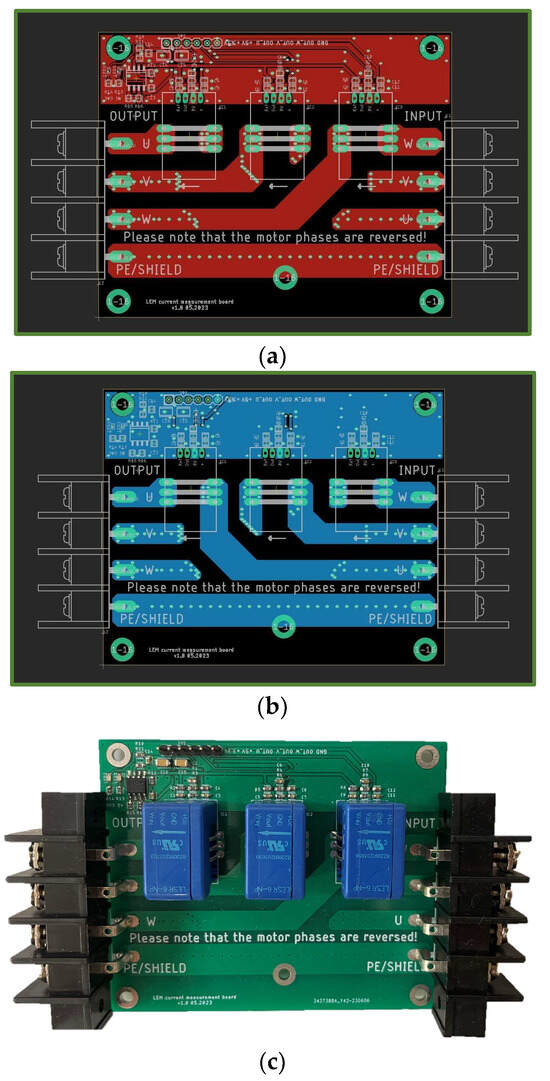The designed stator phase current measuring board: (a) PCB layout, top layer; (b) PCB layout, bottom layer; and (c) photograph of the developed measuring board.