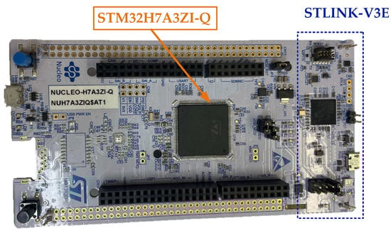 The acquisition and processing of the stator phase current signals measured using the PCB described in the previous subsection, as well as ML-based automatic inference of the winding condition, is performed using the NUCLEO-H7A31ZI-Q development board by STMicroelectronics. This board provides an affordable and flexible way to try new concepts and cost-effectively build prototypes and is designed to develop new applications efficiently. The key component of this board is the STM32H7A3ZI 32-bit microcontroller. The NUCLEO-H7A31ZI-Q also integrates the STLINK-V3E debugger/programmer and does not require separate probes. It has 3 user LEDs and 2 user and reset push buttons on the board. There are 3 flexible power supply options: ST-LINK USB VBUS, USB connector, and other external sources. Moreover, support for a wide selection of integrated development environments (IDEs) is provided, including the STM32CubeIDE used in this work. An actual view of the NUCLEO-H7A31ZI-Q board, with its key components highlighted, is shown in Figure 5.