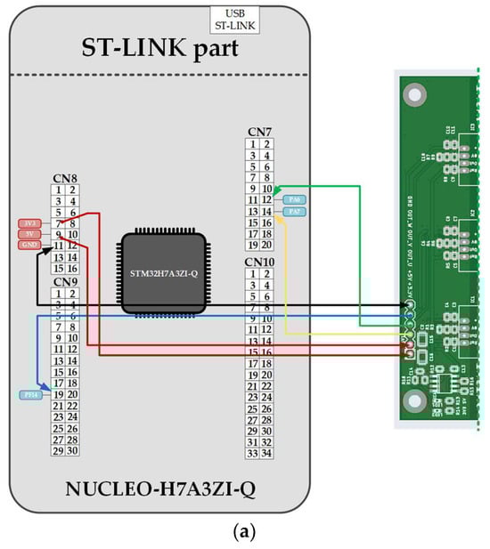 The key to the correct operation of the system under development is the proper acquisition of the diagnostic signal. To implement it, it is necessary to properly configure the ADC module of the microcontroller which will process the output voltage from the measuring PCB, at a setting proportional to the flowing PMSM stator phase currents. For this purpose, three channels of the 16-bit successive approximation ADC2 module were used in single-ended mode. The three output voltage signals from the measuring PCB (OUT_U, OUT_V and OUT_W) were connected to the PA7, PA6 and PF14 pins of the microcontroller, which correspond to channel 7 (ADC2_INP7), channel 3 (ADC2_INP3) and channel 6 (ADC2_IN6) of the ADC2 module. The interface between the stator current measuring module and the data acquisition and processing module is presented in Table 3. The illustrative diagram and a photograph of this interface are presented in Figure 7.