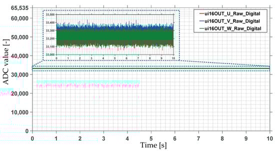 In the ADC2 interrupt subroutine, the acquired output voltages of the LEM current transducers are read and assigned to the uint16 variables (ui16OUT_U_Raw_Digital, ui16OUT_V_Raw_Digital, ui16OUT_W_Raw_Digital). The largest digital value that can be output by the 16-bit ADC2 is determined by the number of unique values it can represent. For the 16-bit ADC, it is 216 distinct values. The maximum decimal digital value that can be read is 65,535 (the counting is started from 0). The raw digital values read by the ADC when no currents flowed through the measuring PCB are shown in Figure 8.
