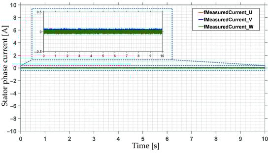 The waveforms of the calculated stator phase currents (fMeasuredCurrent_U, fMeasuredCurrent_V, fMeasuredCurrent_W float type variables) in the absence of current flow are shown in Figure 10. In this case, the value is close to 0, confirming that the measurement and acquisition configuration is correct.