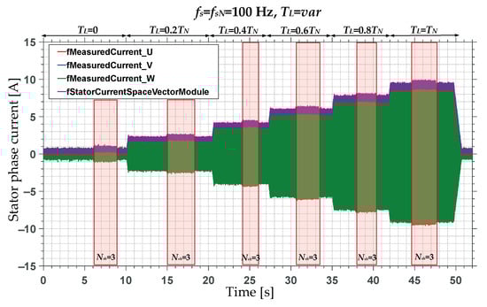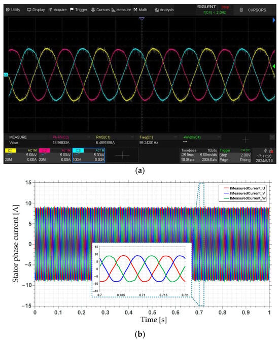 The stator phase current signals were measured using a developed PCB with LESR 6-NP current transducers. The data acquisition and processing were based on the NUCLEO board already described. The application was written in the C programming language. The stator phase currents were also recorded using a Siglent (Siglent, Helmond, the Netherlands) SDS2104X digital oscilloscope and PINTEK (PINTEK, Shulin, New Taipei City, Taiwan) PA-655 current probes (Figure 6c). Motor control was realized in the Lenze (Lenze, Aerzen bei Hamelb, Germany) Engineer software (v2.30) application, while load torque was controlled in Veristand. The microcontroller’s pin configuration was realized using the Integrated Development Environment (IDE) developed by STMicroelectronics (STMicroelectronics, Plan-les-Ouates, Geneva, Switzerland) (STM32CubeIDE v1.16.0).