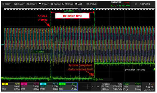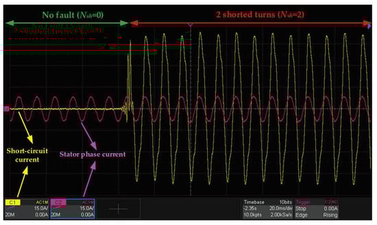 Stator phase current waveforms recorded with an oscilloscope and measured and acquired using the developed low-cost condition monitoring system are shown in Figure 11a and Figure 11b, respectively. These waveforms correspond to the operation of the tested PMSM at the rated load torque. Based on the comparison of these waveforms it can be concluded that the measurement and acquisition of the diagnostic signals are plausible.