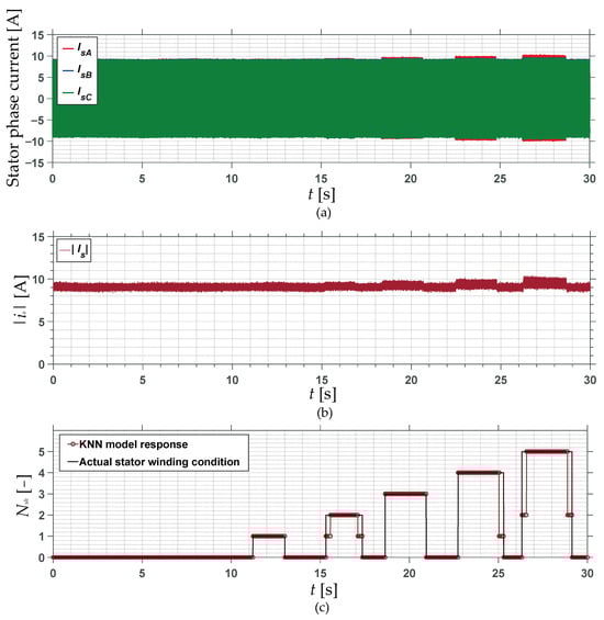 Methods for diagnosing faults in the stator windings of AC motors have been continuously developed for many years. In the last decade, special attention has been paid to new methods of fault diagnosis and the condition monitoring of PMSMs. Based on the recent literature-review papers, it can be concluded that the problem of fault diagnosis of PMSM stator windings has been widely developed by many research centers around the world [17,18,19,20,21,22]. There is an intensive search for both methods of extracting the symptoms of this type of fault at an early stage of its propagation, and methods of automating the process of its detection and classification.