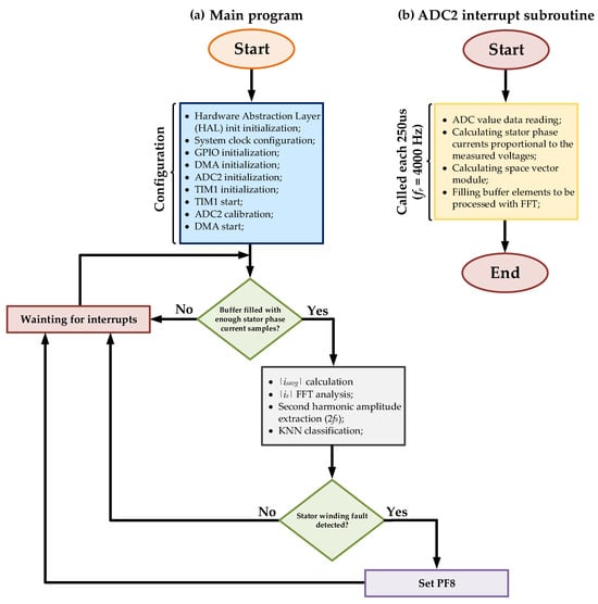 The STM32H7A3ZI-Q microcontroller used is in a 144-pin LQFP144 package. It is based on the ARM Cortex-M7 core, which operates at a frequency of up to 280 MHz. ARM Cortex-M processors are currently one of the best choices, and are seen in a wide range of applications. ARM reported a record 4.4 billion Cortex-M processor chips sold in the fourth quarter of 2020, confirming the chip’s very high popularity. These microcontrollers are characterized by high reliability, strong performance and affordability [67,68]. The STM32H7A3ZI-Q microcontroller has a double-precision floating point unit (FPU) and provides 2 Mbytes of flash memory and 1.4 Mbytes of SRAM memory. It features 5 Direct Memory Access (DMA) controllers to unload the CPU during operation. Key peripherals of this microcontroller include two 16-bit ADC modules, each supporting up to 24 channels, and two 12-bit DACs. It also supports a set of Digital Signal Processing (DSP) instructions which allow efficient signal processing and execution of the complex algorithms. It provides communication peripherals such as I2C, USARTs, SPIs and CAN. These features make the STM32H7A3ZI-Q microcontroller suitable for various applications, including the condition monitoring and fault diagnosis of AC motors. Nevertheless, the price of this microcontroller is slightly higher than those of microcontrollers with lower computing power also from the ARM family (e.g., with M0, M3 or M4 cores). In the future, it is planned to study the possibility of developing diagnostic methods on microcontrollers of even lower cost. The key features of this microcontroller are grouped in Table 2.