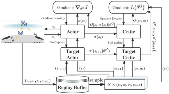 The DDPG algorithm merges the aspects of actor–critic algorithms with deep learning techniques to enable effective policy learning in high-dimensional, continuous action spaces. The core of DDPG lies in learning a deterministic policy, which specifies the action to be taken in each state, along with a Q-function that estimates the expected returns. The architecture of the DDPG algorithm is shown in Figure 2.