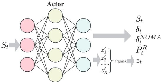 However, the DDPG algorithm does not perform well with certain discrete variables, especially those that represent the selection of indices. Therefore, we modified the architecture of the actor network, as shown in Figure 3. Actions and in the action space are exactly such discrete variables. Although for , which is a binary variable, the tanh function can effectively solve the binary classification problem. As for the variable , if the number of servers is more than two, this becomes a multi-class variable, and common activation functions struggle to address this issue. We process as follows: