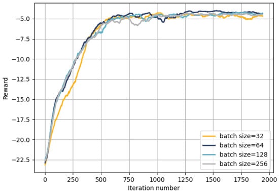 In reinforcement learning algorithms, batch size is a critical hyperparameter. Smaller batch sizes can enhance generalization and facilitate the escape from local optima but may increase variance, affecting learning stability. Larger batch sizes provide more accurate gradient estimates, though they may lead to local optima and increased memory requirements. Figure 4 shows the influence of batch size on convergence. The calculation method of the reward is shown in Equation (23). The DDPG algorithm obtains rewards through interaction with the environment and learns to achieve higher rewards. Higher rewards also imply a lower average delay ratio. Despite the initial rapid increase and subsequent stabilization of the reward curves across four batch sizes, it indicates that our improved DDPG algorithm can learn a stable computation offloading policy. Notably, a batch size of 64 yields better rewards. Therefore, we set the batch size to 64 in subsequent simulations.